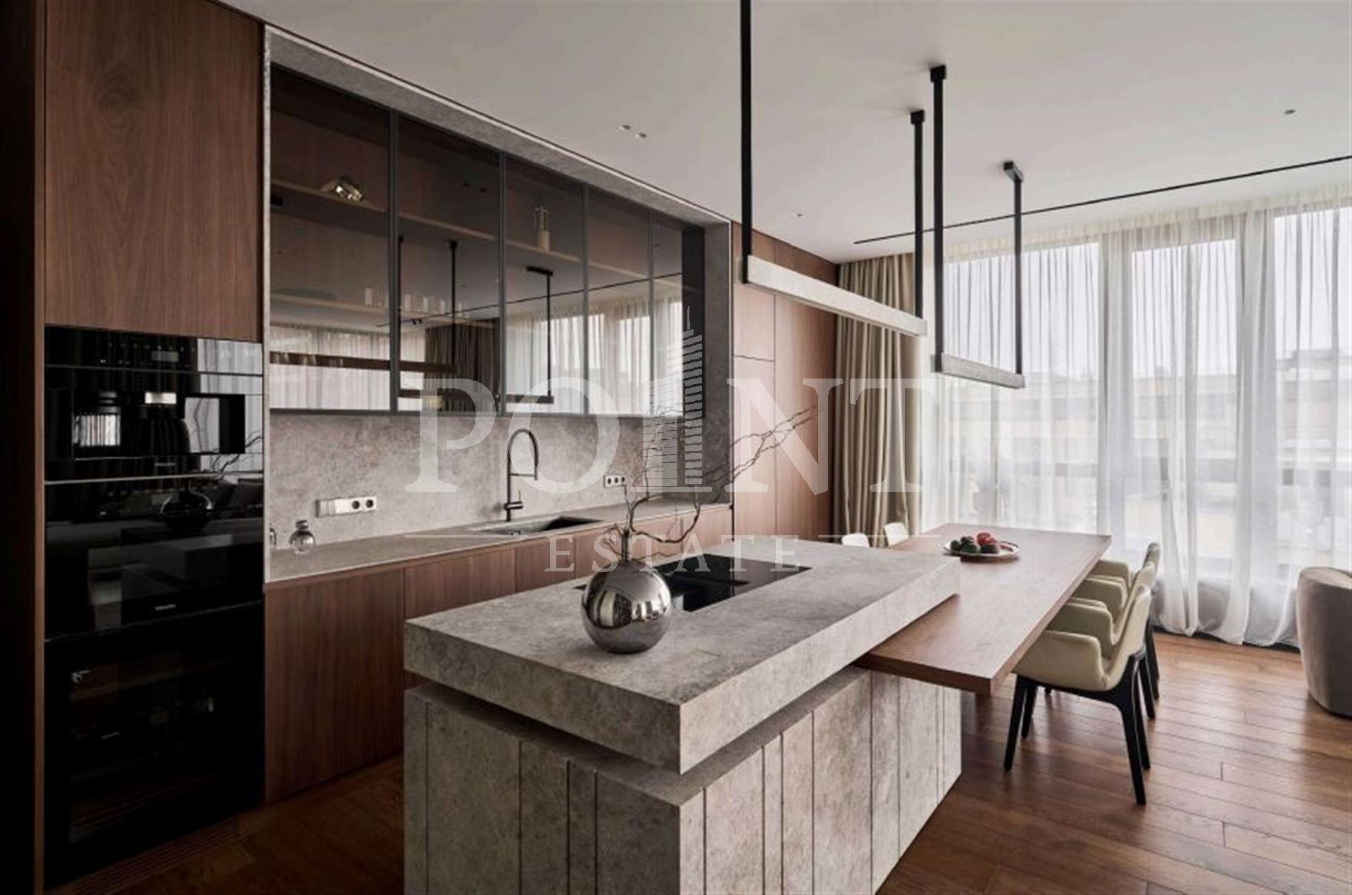 На продажу предлагается пятикомнатная квартира, площадью 200 кв.м., с новым ремонтом в ЖК "Фьюжн Парк". Планировка: кухня-гостиная с обеденной зоной, две спальни, одна из которых со своим санузлом, две спальни с санузлами и гардеробными, совмещенный санузел, постирочная, прихожая. Высота потолков - 3,2 м. Из панорамных окон открывается вид на парк Усадьба Трубецких. В отделке использованы натуральные материалы премиального качества, такие как шпон дуба, сатинированная сталь и мрамор. Установлены системы индивидуального кондиционирования Daikin, форсуночного увлажнения UniverseDIY, приточно-вытяжная вентиляция, защита от протечек, комплексная шумоизоляция пола, стен и потолков. Техника: Miele, Liebherr. Мебель: Minotti, FlexForm, Poliform, Cattelan Italia, ковры Bo Concept. Внутри жилого комплекса работает фитнес-клуб, магазины, ресторан и кофейни. Входные группы оформлены камнем и деревом, на закрытой территории - аллеи и зоны отдыха. Для жителей предусмотрен подземный паркинг и консьерж сервис.