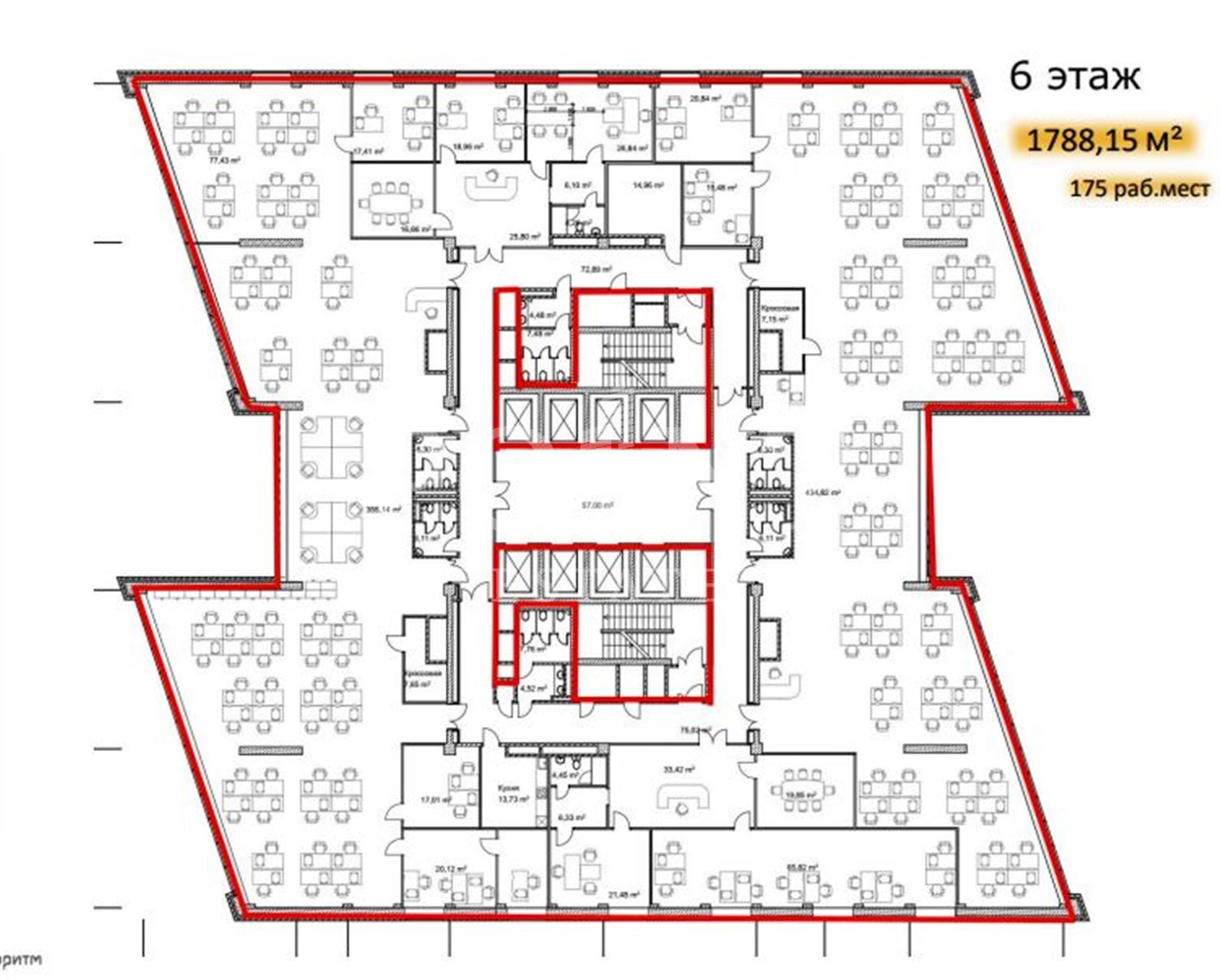 Предлагается в аренду половина офисного этажа площадью 908,5 кв.м. на 6 этаже. Рассадка организована на 85 сотрудников. Планировка смешанная. В офисном блоке предусмотрены рабочие зоны с отдельными кабинетами, зона приема посетителей, VIP-зона для руководителя с собственным санузлом и душевой кабиной, мини-кухня, переговорные. Стеклянные перегородки, ковролин, панорамные окна и высокий уровень инсоляции. Двухуровневый подземный паркинг. 1:85 коэффициент. 12 500 рублей + ндс за м/м. Есть гостевой паркинг с почасовой оплатой. Дизайн фасада, входной группы, общих зон БЦ , концепт благоустройства разработан известной студией дизайна SCG INTERNATIONAL. Класс А, 2015 г. постройки. Своя столовая. кафе и кофе-поинты, банкоматы и шаттл-басы от м. Новые Черемушки. Арендатор имеет право доступа в Бизнес-Центр 24х7.