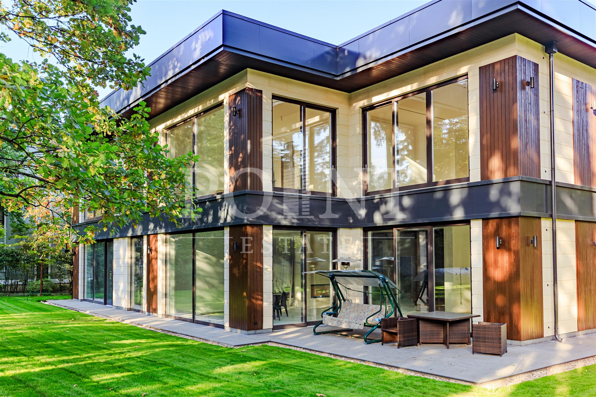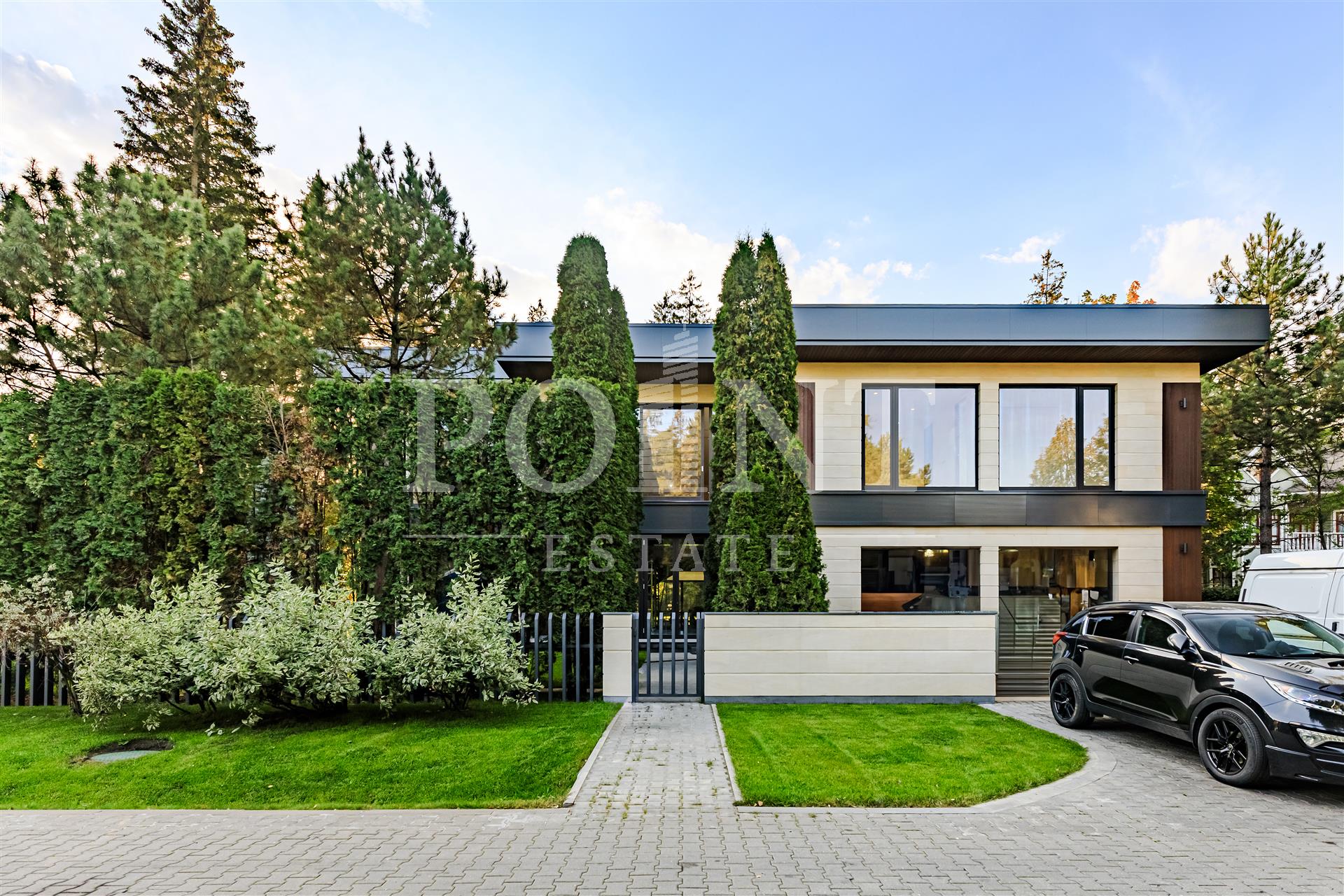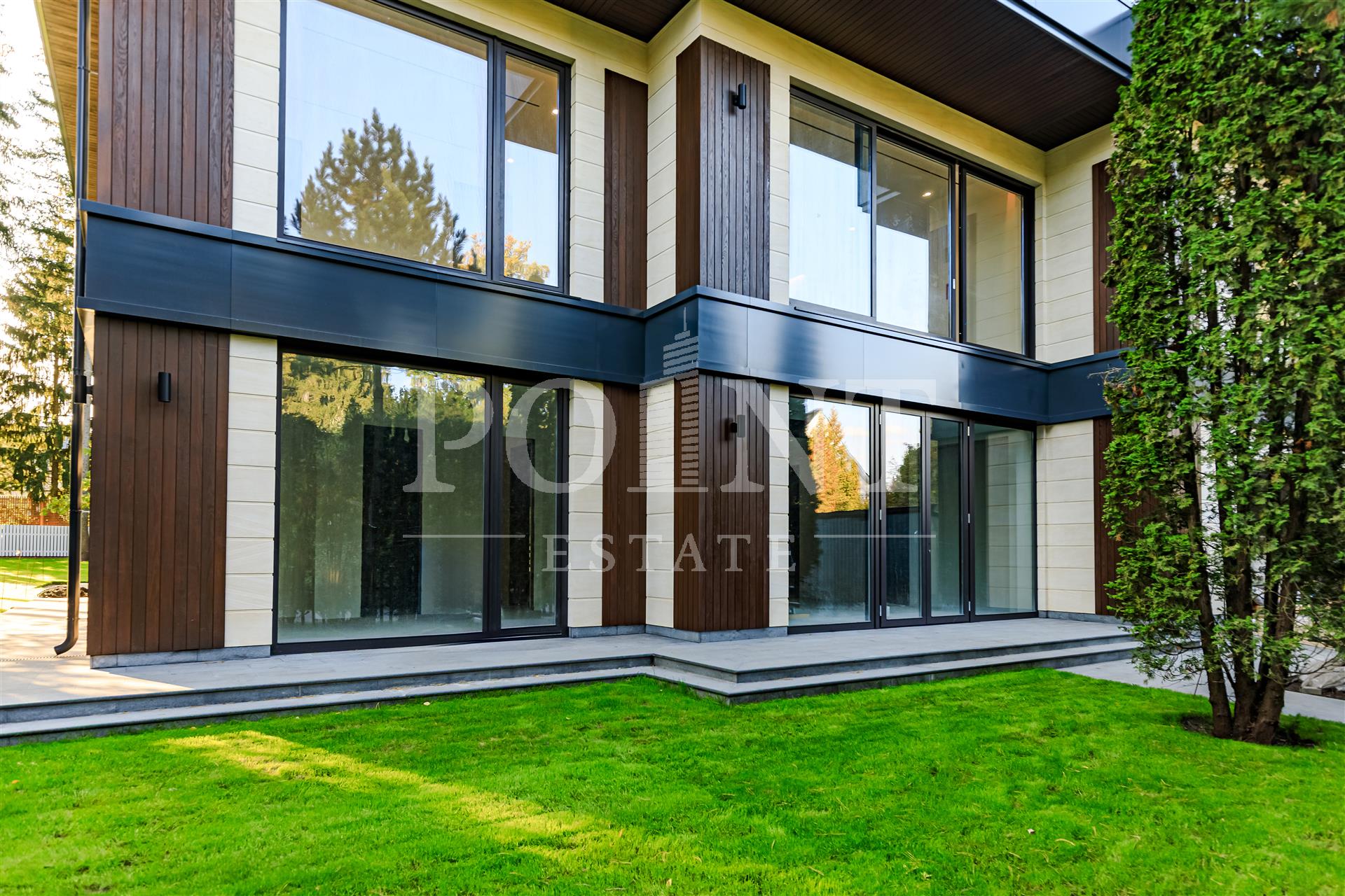 Современный загородный дом в три уровня площадью 1 600 кв.м под финишную отделку (White box) построен в тихом месте на лесном участке 29 сотка в премиальном поселке "Николино". Фасад выполнен из высококачественных натуральных премиальных материалов. Во всем доме большие современные панорамные окна из дерева без горизонтальных перемычек. Современное инженерно-техническое оборудование лучших мировых производителей. Для удобства перемещения между уровнями имеется лифт. Полноценный 1-й уровень (цоколь) с потолками выше 3 метров, где предусмотрены бильярдная, кинотеатр, массажный кабинет, рабочая кухня, блок для персонала с отдельным входом. Есть бассейн 12 метров в длину и сауна с панорамными окнами и прекрасным видом. Уже сформированный ландшафтный дизайн. Красивая и сдержанная входная зона с высокими туями.