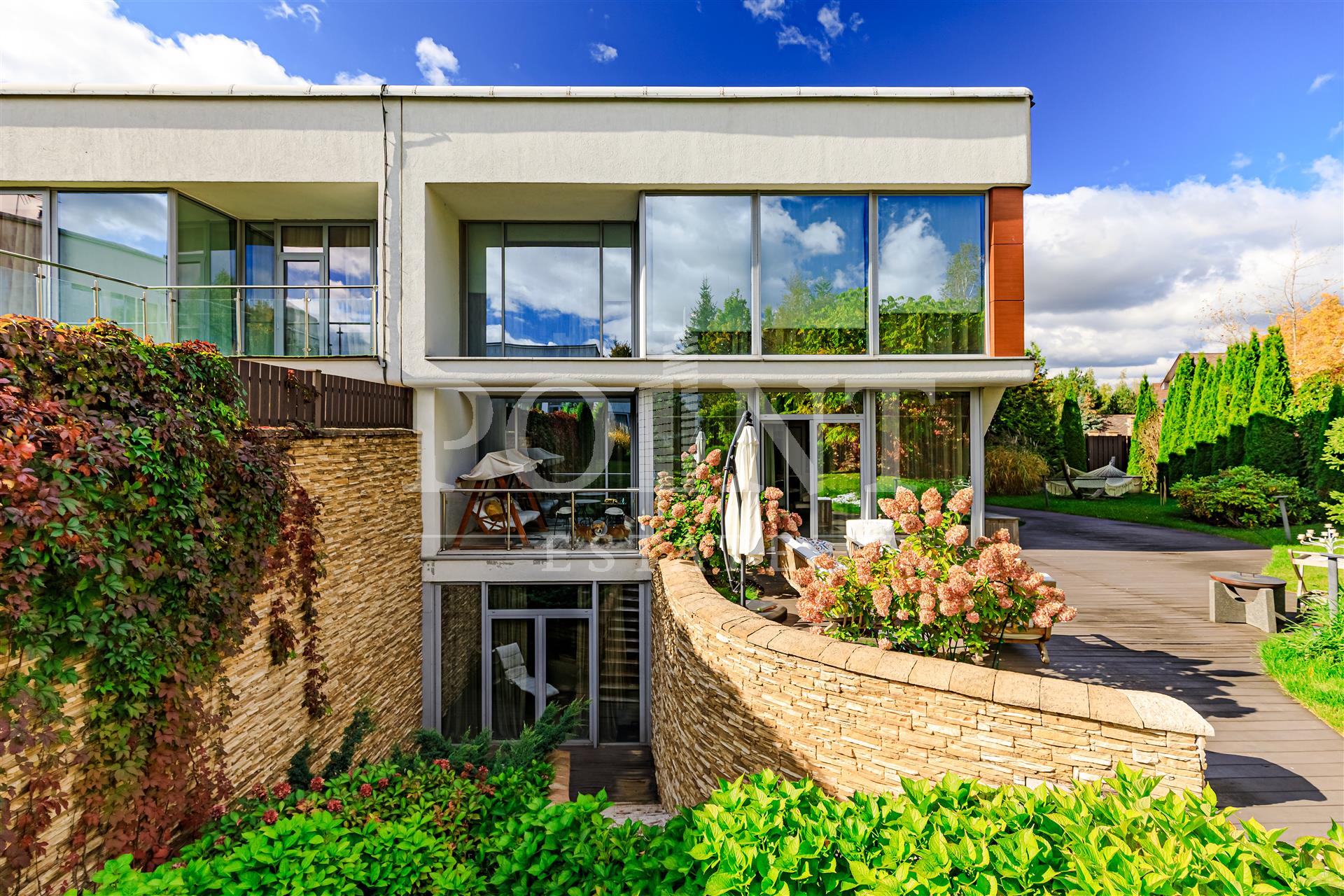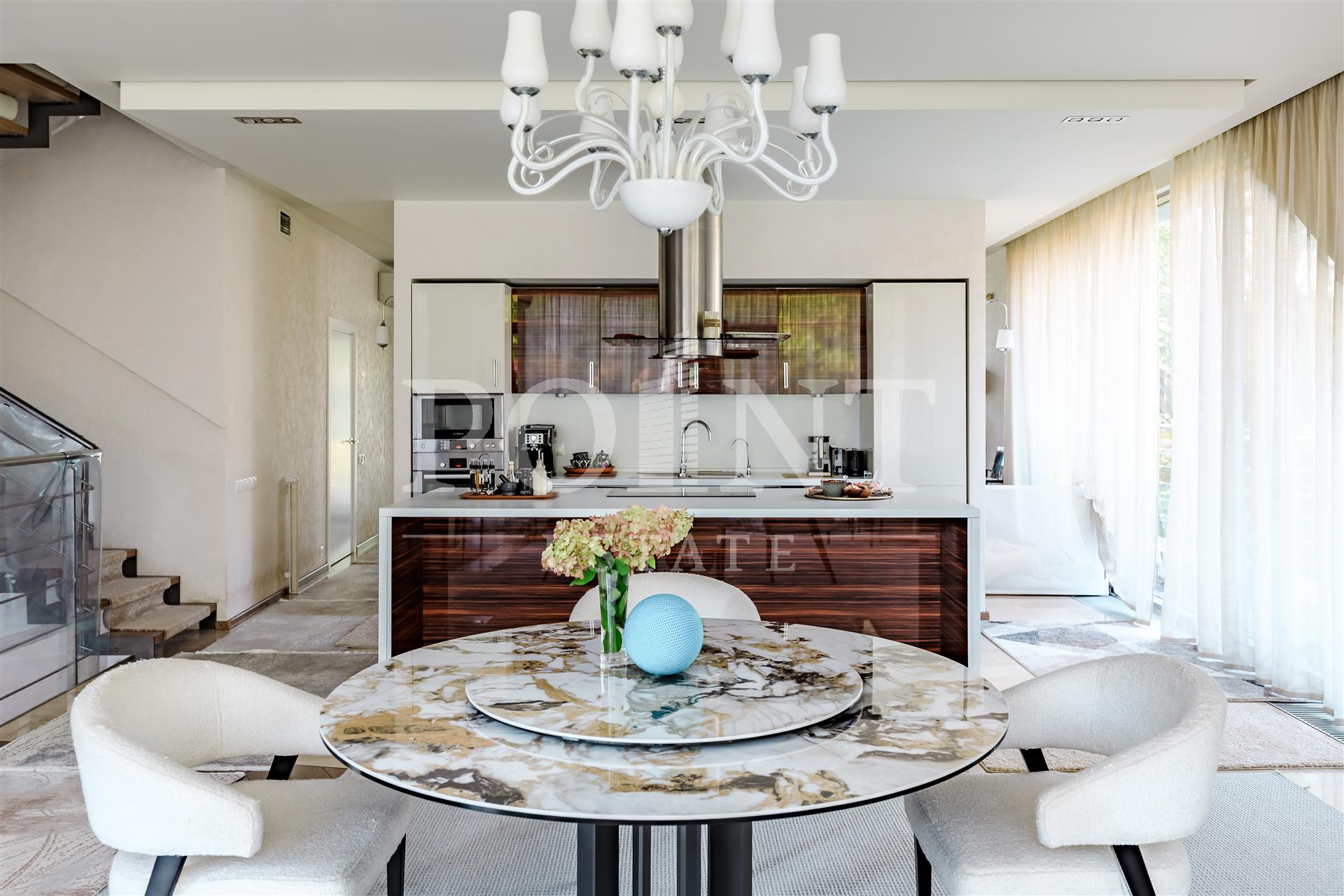 Современный трехуровневый дуплекс на просторном участке с красивейшим ландшафтным дизайном в КП "Барвиха Хиллс" - в сердце самой престижной и живописной Рублёвки. Комфортная планировка. На первом уровне (цоколь) находится двусветная гостиная, гостевой санузел, СПА-зона с сауной, душевой и комнатой отдыха, холл, гардеробная, постирочная, котельная, прихожая. Второй уровень занимает гостиная с камином на биотопливе, кухня, совмещенная с обеденной зоной, гостевой санузел, холл, гардеробная, прихожая, лоджия. Третий уровень включает в себя две спальни с гардеробными и санузлами, спальню с гардеробной, еще одну спальню, холл, полноценный санузел. Предусмотрен встроенный гараж на два машино-места. Также на участке расположен гостевой домик с камином, зона барбекю, зона релаксации, высажены красивые парковые и садовые растения.