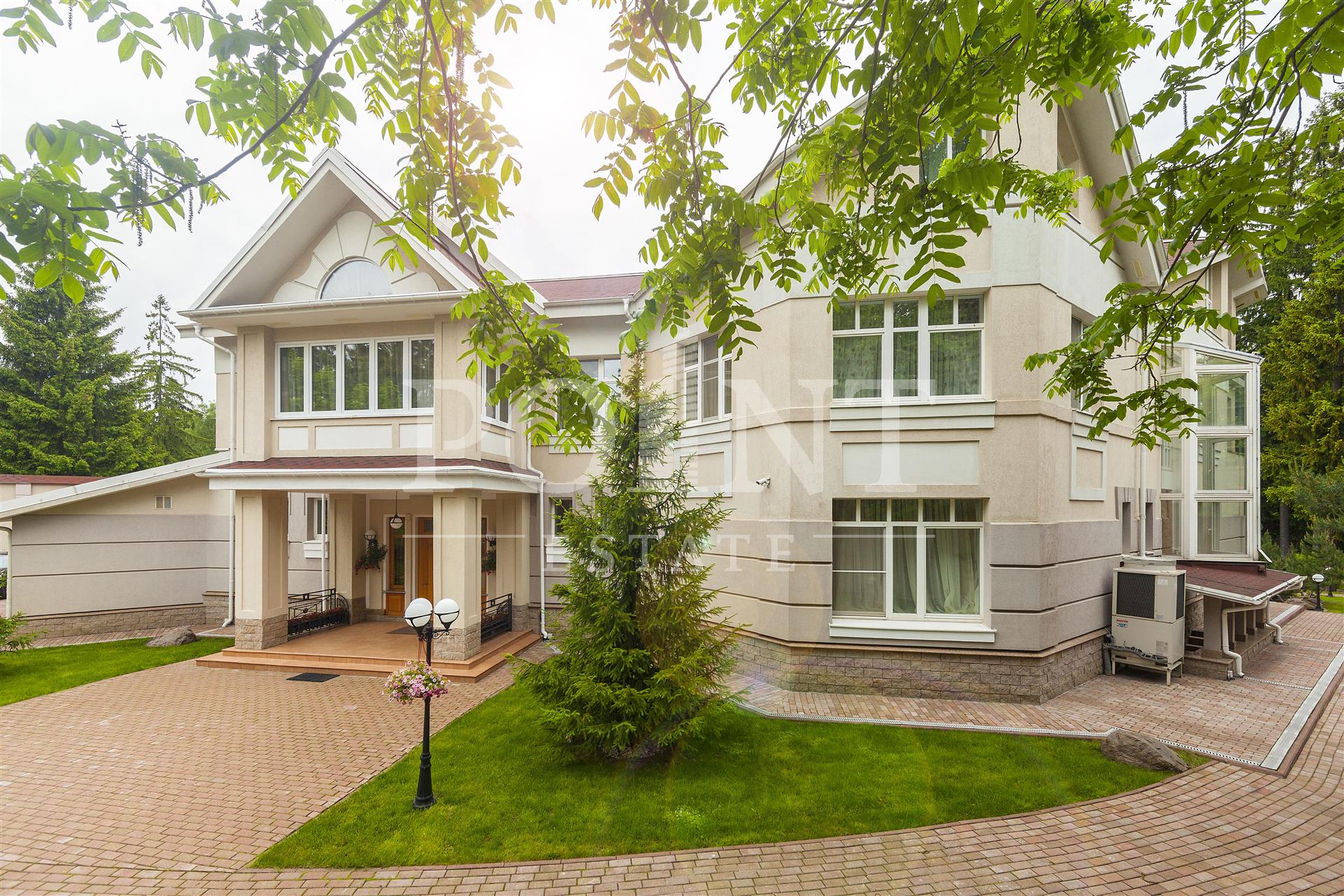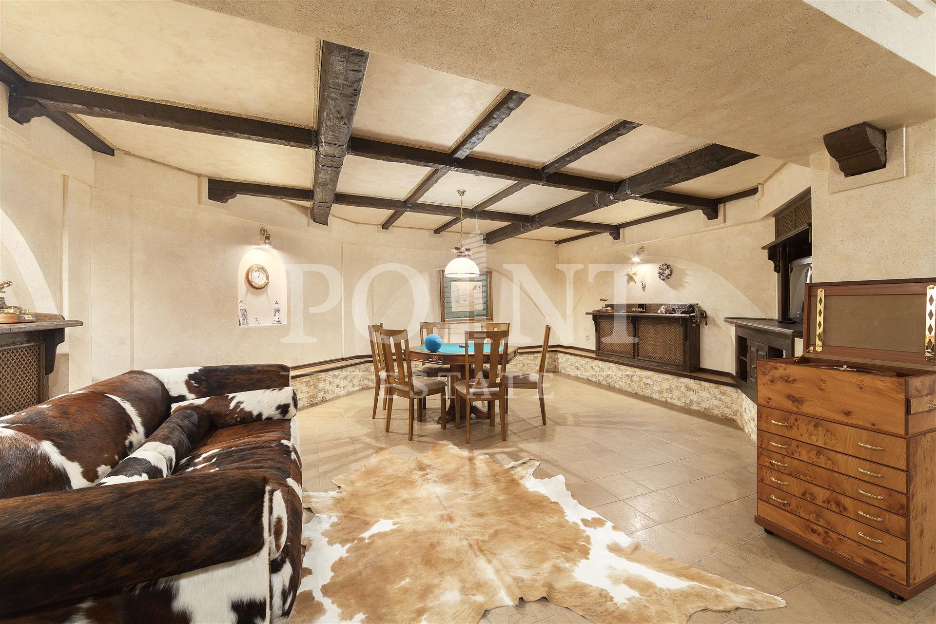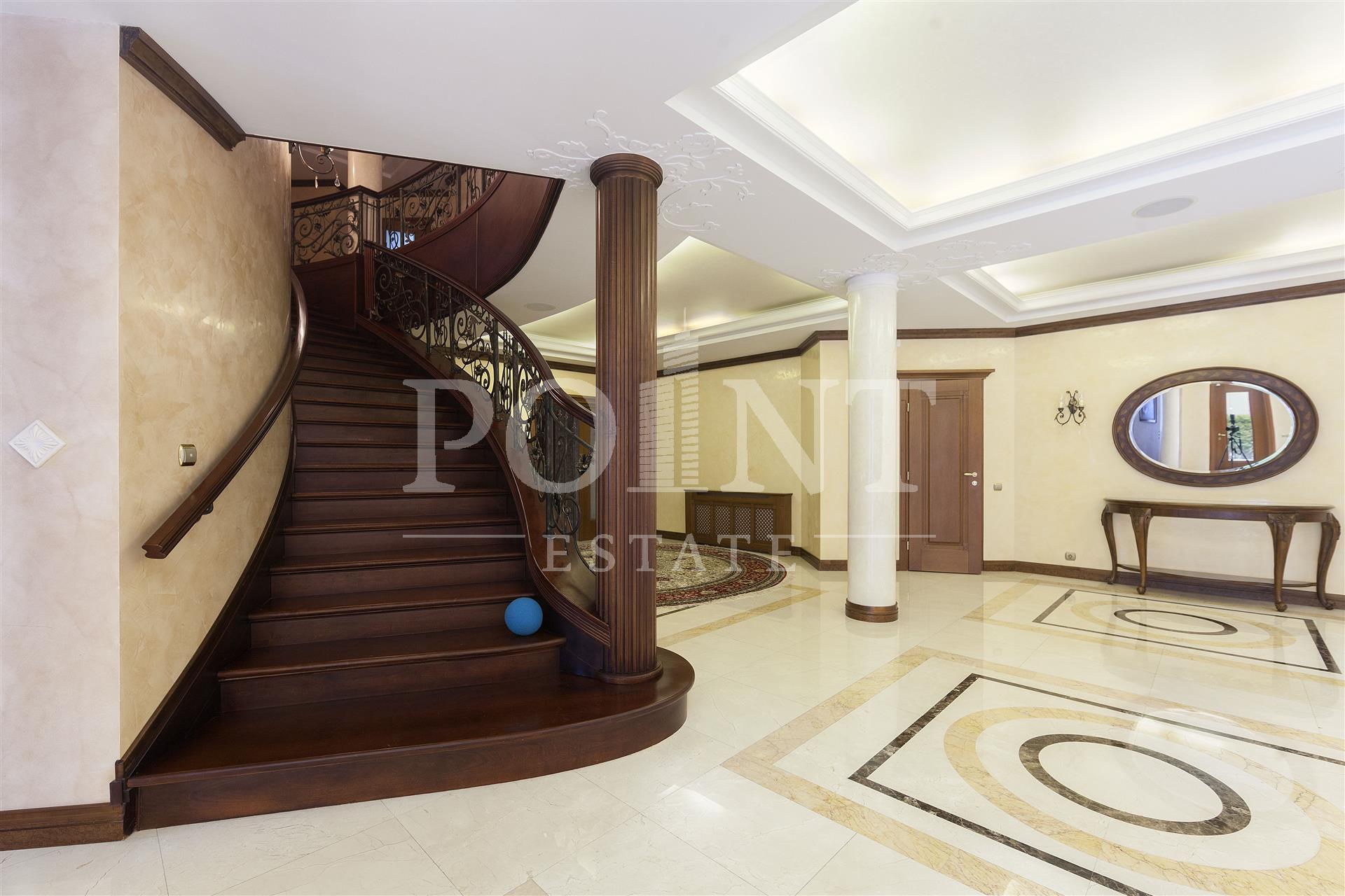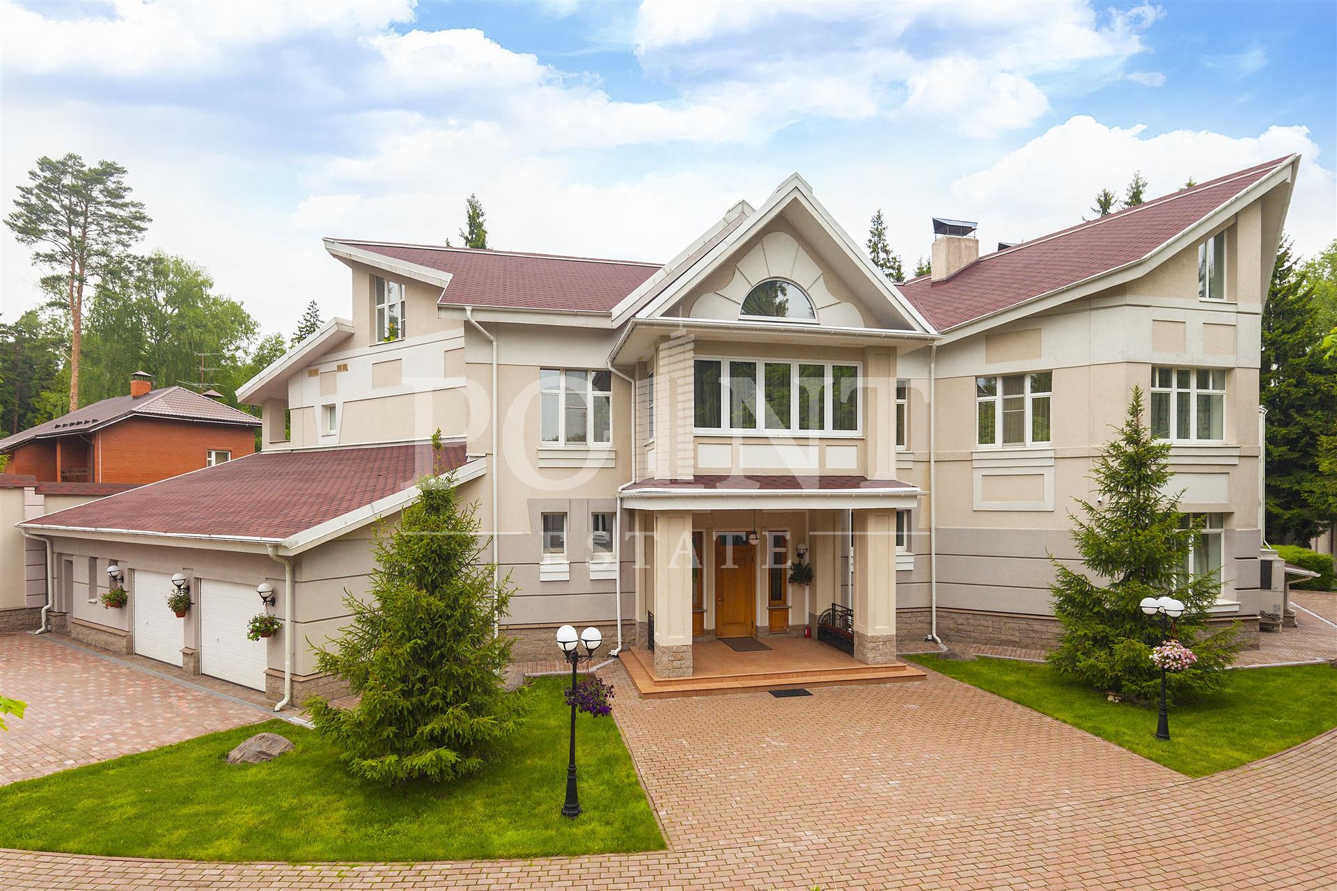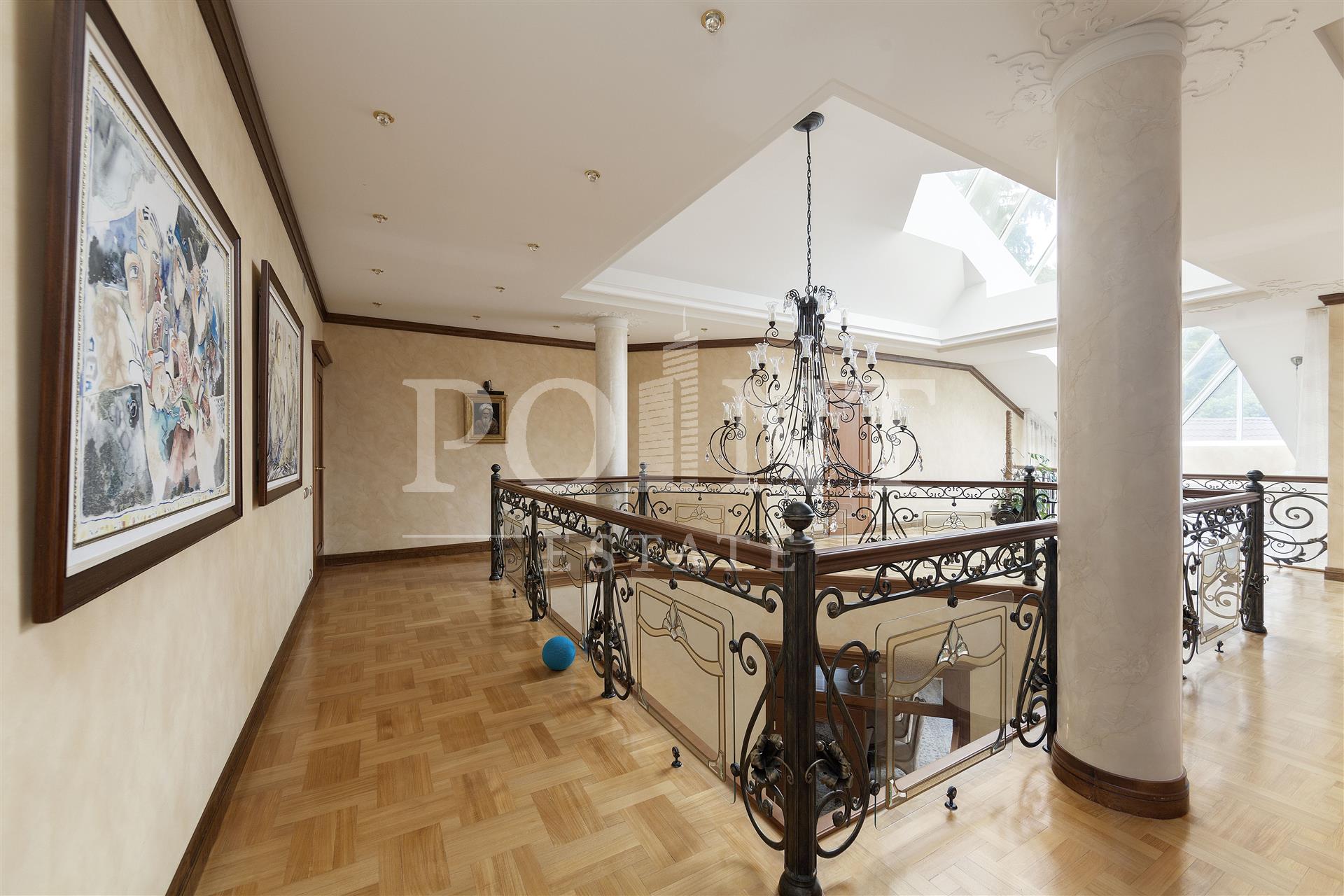 Загородный дом в четыре уровня площадью 1 450 кв.м. "под ключ" с мебелью расположен на благоустроенном участке 50 соток, в охраняемом коттеджном поселке, со всех сторон окруженного густым хвойным лесом. Дом оснащен системами видеонаблюдения и сигнализации; предусмотрено помещение для охраны. Функциональная планировка. На цокольном уровне находится комната отдыха, санузел, кладовая, постирочная, котельная и техническое помещение. Первый уровень вместил прихожую, гостиную, кухню, столовую, два полноценных и один гостевой санузлы, бассейн, сауну, купель, кинотеатр, гардеробную, большой холл и гараж на два машиноместа. Второй уровень представлен большим холлом и пятью спальнями с индивидуальными гардеробными и санузлами. Мансарда отведена под кабинет, две спальни с санузлами, большой холл, комнату отдыха и гардеробную.