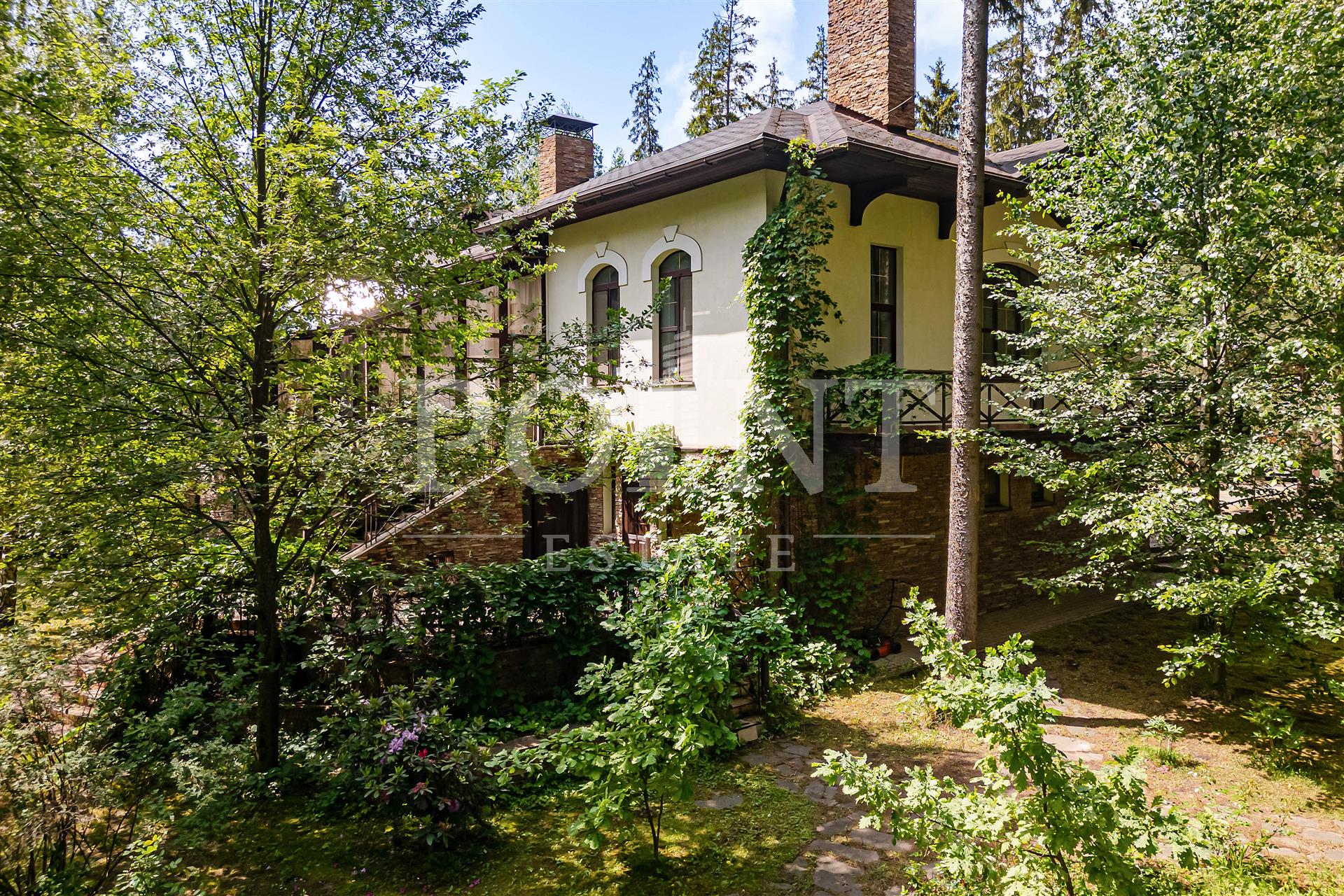 Загородный дом в два уровня площадью 460 кв.м располагается на благоустроенном участке 30 соток с двумя прудами в окружении хвойных деревьев в престижном коттеджном поселке "Грибово". На первом уровне (цоколь) находится кухня, комната отдыха, бильярдная, тренажерный зал, постирочная, гардеробная, котельная, кладовая. Второй уровень занимает гостиная с камином, кухня, совмещенная с обеденной зоной, кабинет, три спальни, одна из которых с санузлом, полноценный и гостевой санузлы, зимний сад, холл, терраса. Предусмотрен встроенный гараж на два машино-места. Имеется беседка с зоной барбекю. На территории поселка есть живописное озеро, оборудованы современные детские площадки, также недалеко расположены другие объекты инфраструктуры, обеспечивающие комфортное проживание за городом.