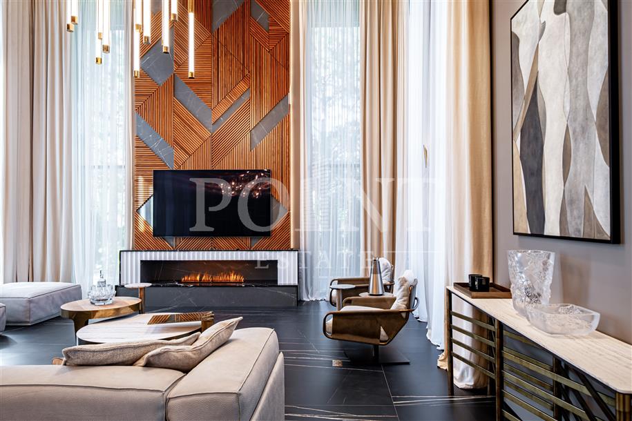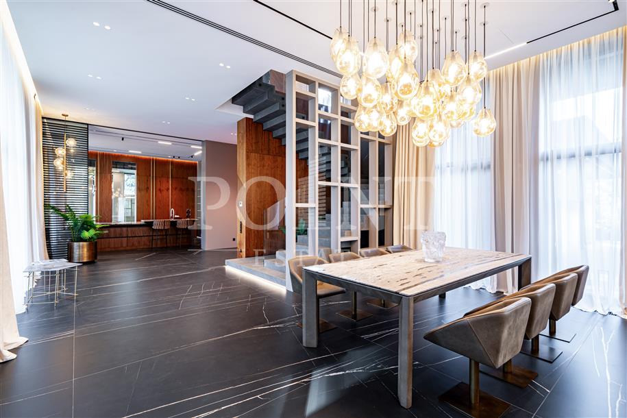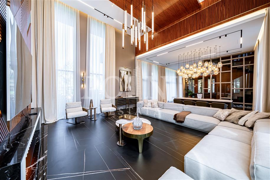 Трехуровневый загородный особняк площадью 691 кв.м располагается на участке 28,32 сотки в окружении хвойных деревье в элитном коттеджном поселке "Довиль". Внутренне пространство выдержано в элегантной современной классике, отделка и меблировка представляют собой единое дизайнерское решение. Высококлассная дорогая мебель, современная техника премиальных брендов, тщательно подобранные аксессуары. На первом уровне находится гостиная с камином, кухня, столовая, кабинет, санузел, сауна, джакузи, комната отдыха, холл, постирочная, котельная. Второй уровень занимают три спальни с гардеробными и санузлами, холл, комната отдыха. Третий уровень (мансарда) отведен под две спальни с гардеробными и санузлами, холл, библиотеку и кладовую. Предусмотрен встроенный гараж для двух автомобилей.